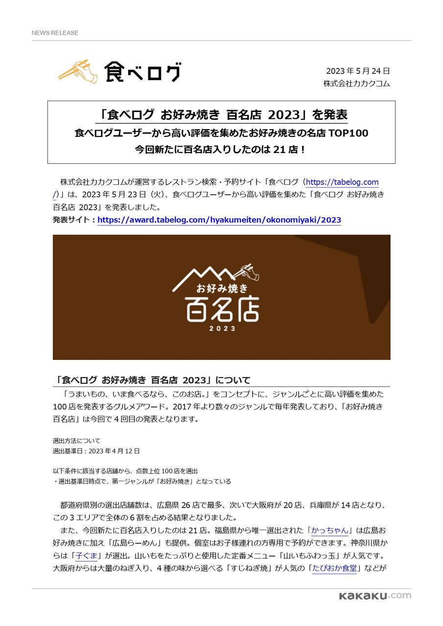 ※『食べログ お好み焼き 百名店 2023』の詳細については、こちら。